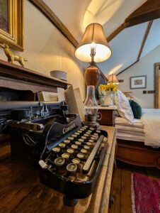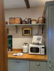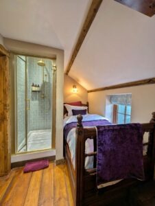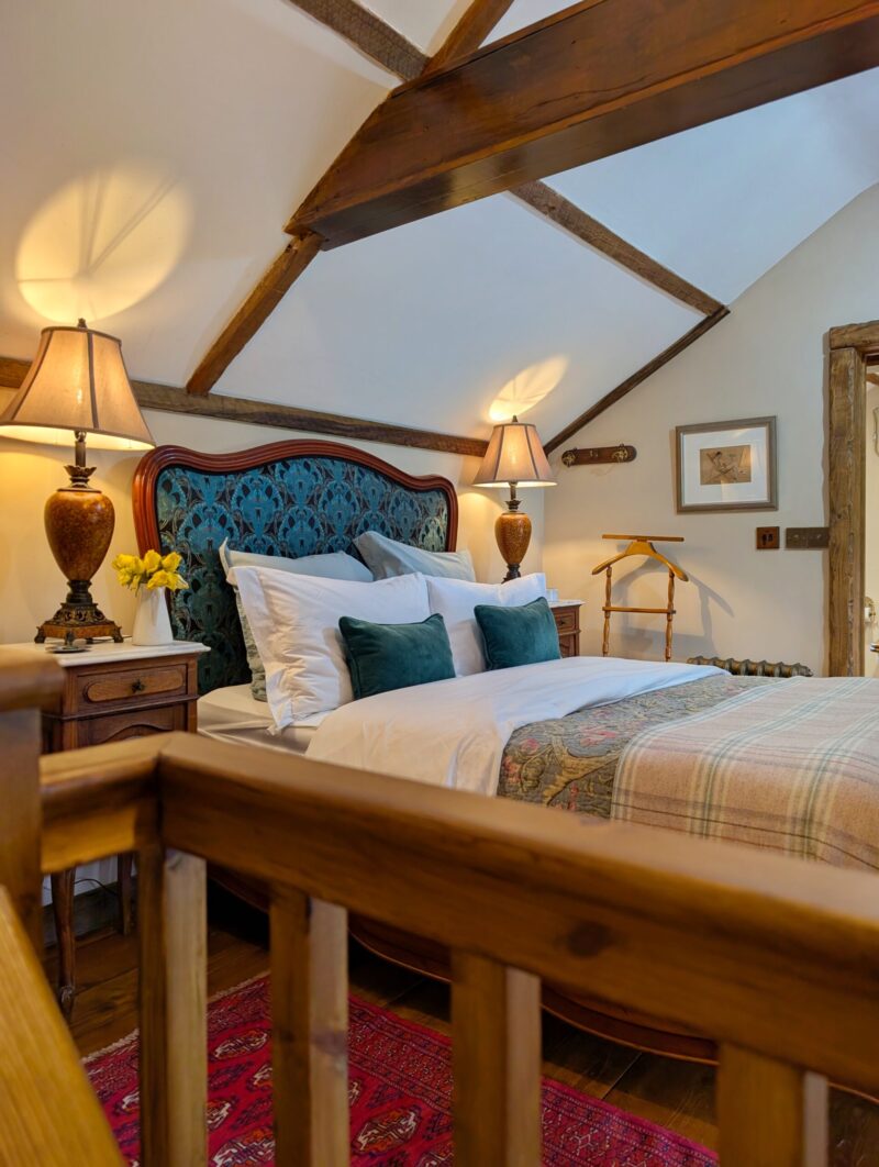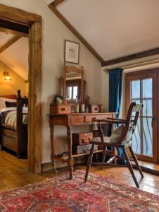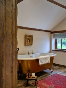 The lounge is the heart of the cottage, warm and inviting with its crackling log burner, casting a cosy glow over the room where a Chesterfield sofa beckons you to sink into its plush cushions. A traditional cottage door leads into a handcrafted kitchen full of rustic charm, discreetly tucked away sleek appliances blend seamlessly into the design so well integrated, they go unnoticed at first glance. At the heart of the kitchen stands the Aga, its cast-iron body radiating a gentle warmth that fills the cottage. The master bedroom exudes timeless elegance, centred around a stunning 1920s French bed with its intricate wood carvings and graceful curves. Draped in silk and velvet bed linen, the bed invites you to sink into luxurious comfort. Antique furniture pieces, each with their own history, are carefully placed around the room, complementing the bed's vintage charm. The centrepiece of the bathroom is the roll top bath, inviting long luxurious soaks. Beside it stands a beautiful Victorian washstand, adding a touch of refinement. Every detail evokes a sense of vintage charm, transforming the room into a timeless space.